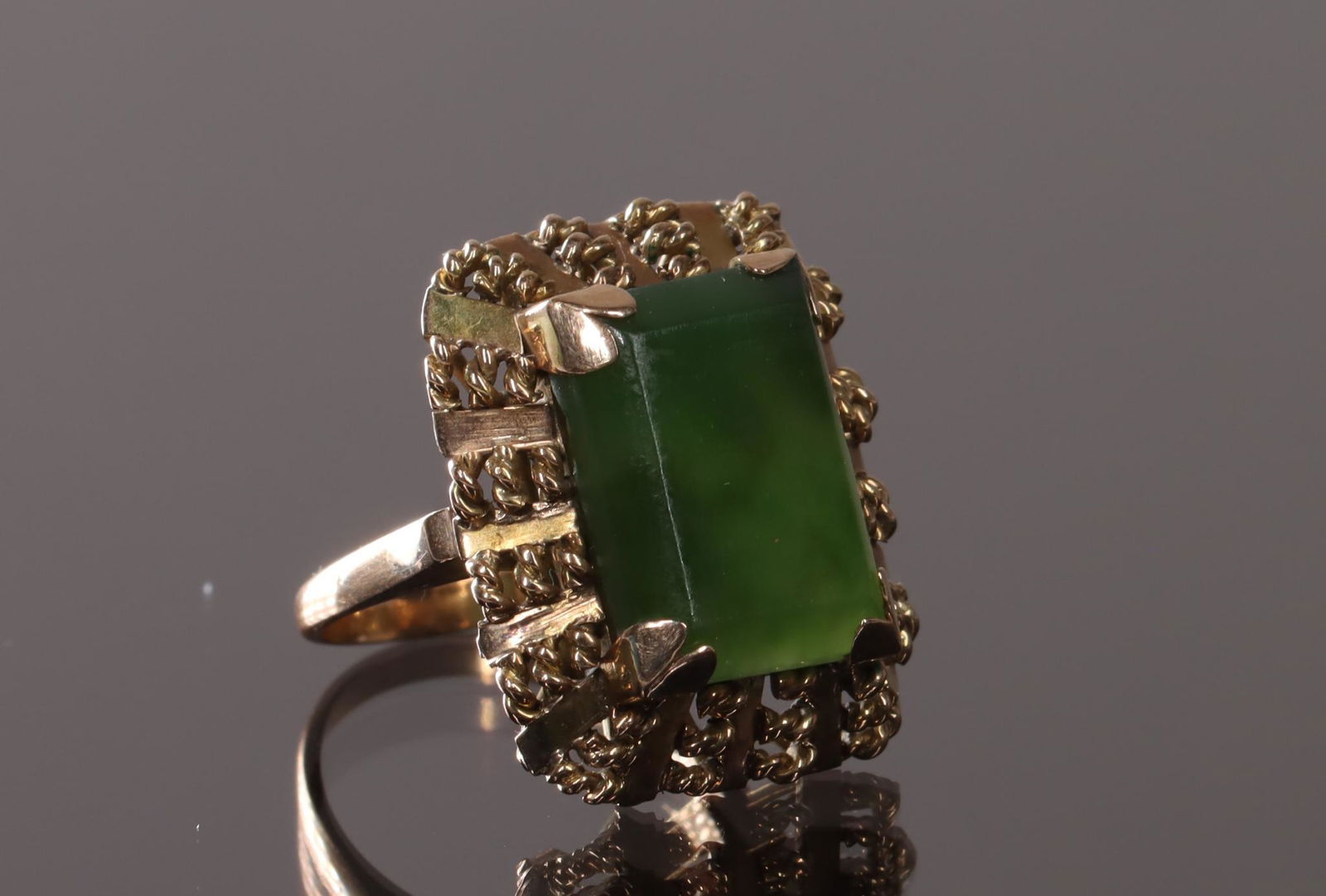 Sold14k Gold Nephrite Jade RingMETAL: 14k Gold. MEASUREMENTS: Ring size - 8.75, ring top - 25mm x 20mm. GEMSTONES; Nephrite jade - 25mm x 18mm. MARKED: 14k. WEIGHT: 9 grams.Gemstones have not been graded for color and clarity ,andSee Sold Price