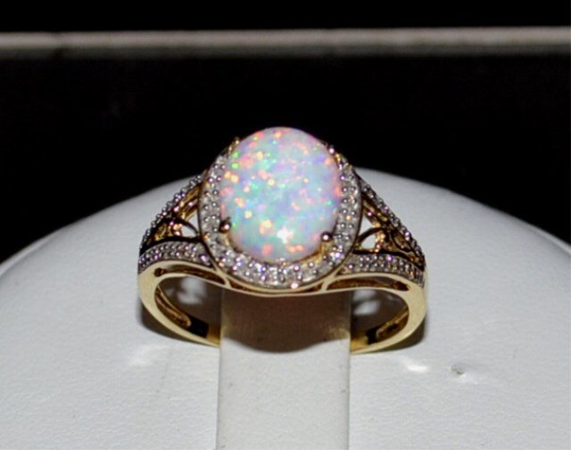 Sold14k Gold 2.98 Ctw Natural Opal & Diamond RingRef:230766438 // gold content:14k gold // ring size:7. 25us // // main gemstone:opal // number of stones:1 // shape:oval // carat weight:2. 92ct // color:color // treatment:natural // cut grade:g // /See Sold Price