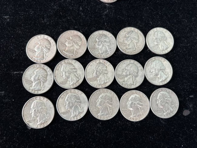 15 circulated 1963 Washington silver quarters