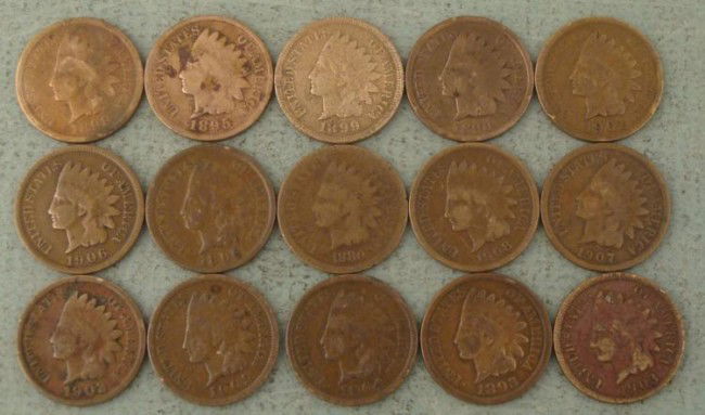 15 Diff Indian Head Penny Cents Dates 1880-1908