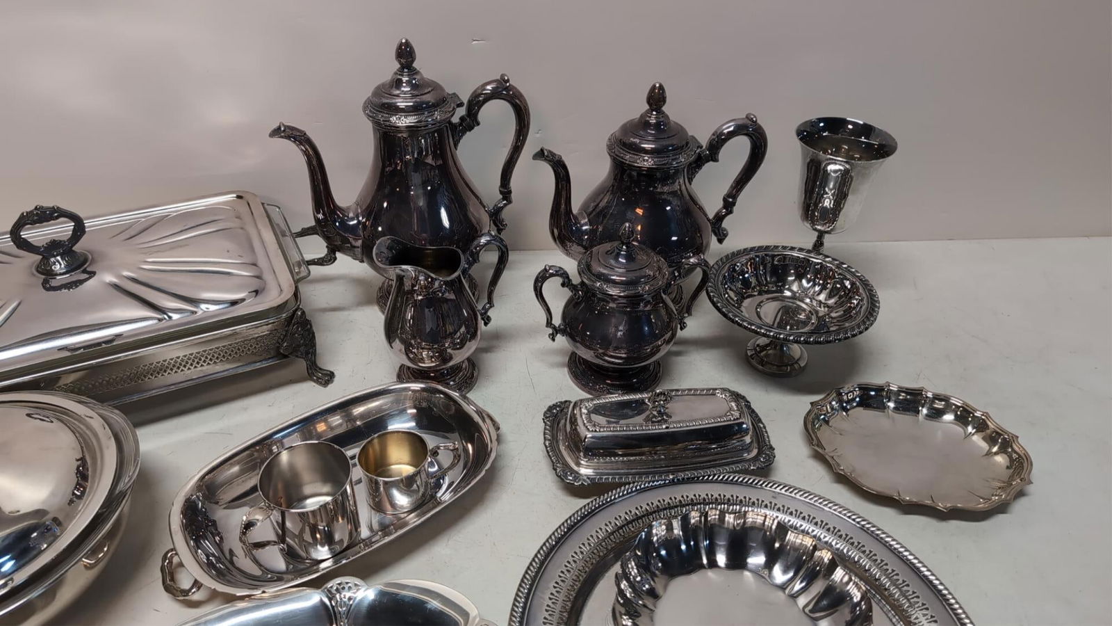 Sterling Silver and Silverplate Lot6 days LeftLot sterling silver hollowware, 2 oval bowls, trophy bowl & tazza, 39 troyMar 09, 2026WEBSTER CO. AND OTHER STERLING SILVER BOWLS AND SPOONS, LOT OF FOUR3 days LeftLot of 7 Pewter/Silverplate ArticlesMar 08, 2026LOT OF SILVERPLATE DESSERT CUPSMar 15, 2026ASSORTED ESTATE SILVER PLATED UTENSILS & TABLEWARE6 days Left6 pcs Vintage Silver Plated Dish Assortment, incl. 1x Rogers, 2x Pairpoint & More! See pics.Collection of Silverplate ServewareMar 22, 2026Collection Of Vintage Silver Plated Bowls - Serving Dishes 8X12"Mar 08, 2026Antique Silver Plated Serving Dishes (Largest 8"X7")Mar 08, 2026Five-Piece Silverplate Serving Group6 days LeftGROUP OF ASSORTED SILVERPLATE, CUT GLASS & FIGURES5 days LeftVictorian & Later Silver-Plate Serving Items (7)Mar 08, 2026Victorian & Other Silver-Plate Serving Pieces (9)Mar 08, 2026Group of 6 Silverplate Tableware Pieces3 days LeftSterling Silver Hostess WareMar 13, 2026