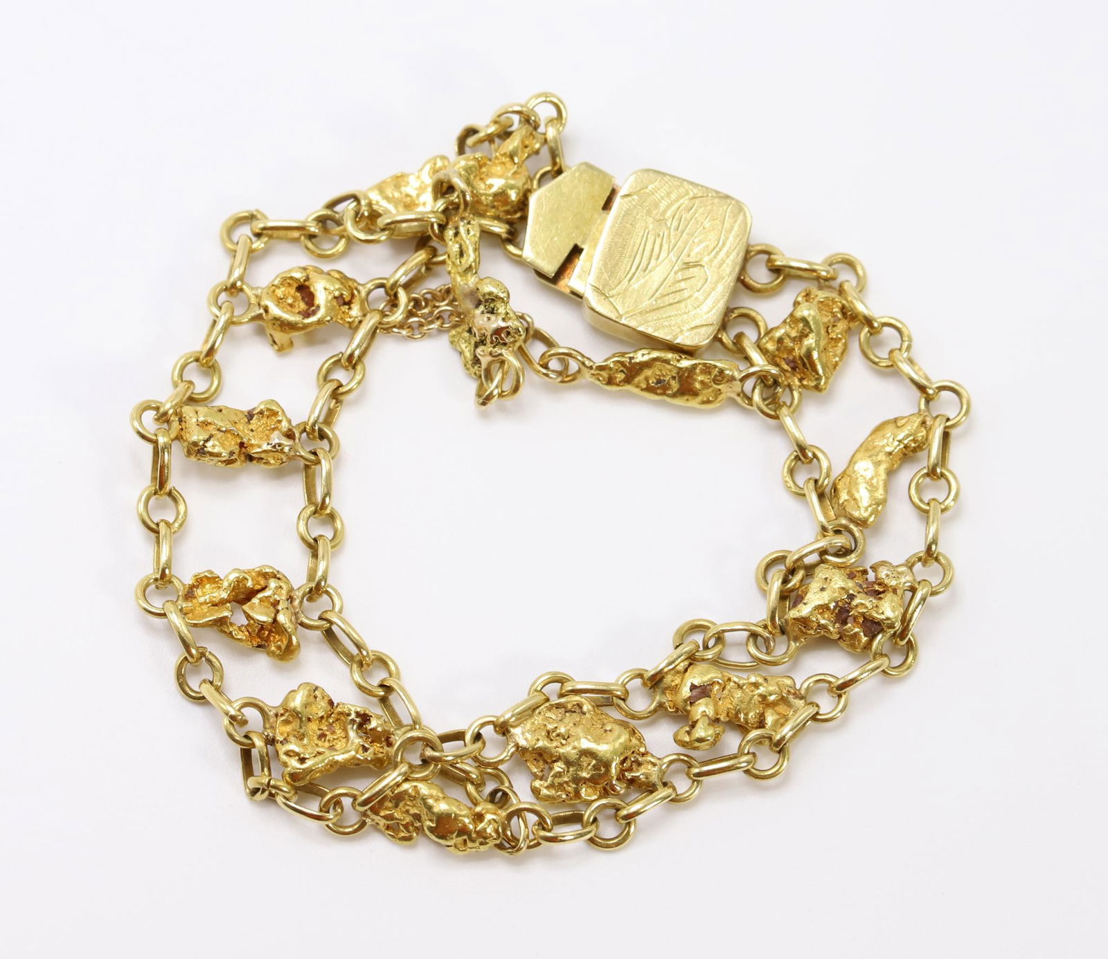 SoldDouble Link Gold Nugget Bracelet 18 DWTDouble link gold nugget bracelet with a box and tongue clasp and a guard chain. 18 dwt. Gold nuggets typically range in purity between 70% to 95%, with the average nugget being 90% (22K) pure. An apprSee Sold Price