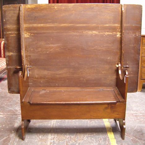 Antique Pine Monk's Table, mid 19th c., Table- H.- 29 1/2 in., W.- 42 in., D.- 31 in., Bench- H.- 48Antique Pine Monk's Table, mid 19th c., the rectangular top with shaped side aprons pierced for four dowel pegs, when two are removed the top flips to reveal a bench, the hinged seat opens to reveal a
