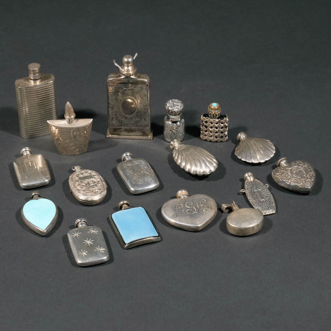 (17pc) SMALL MOSTLY SILVER PERFUME BOTTLES