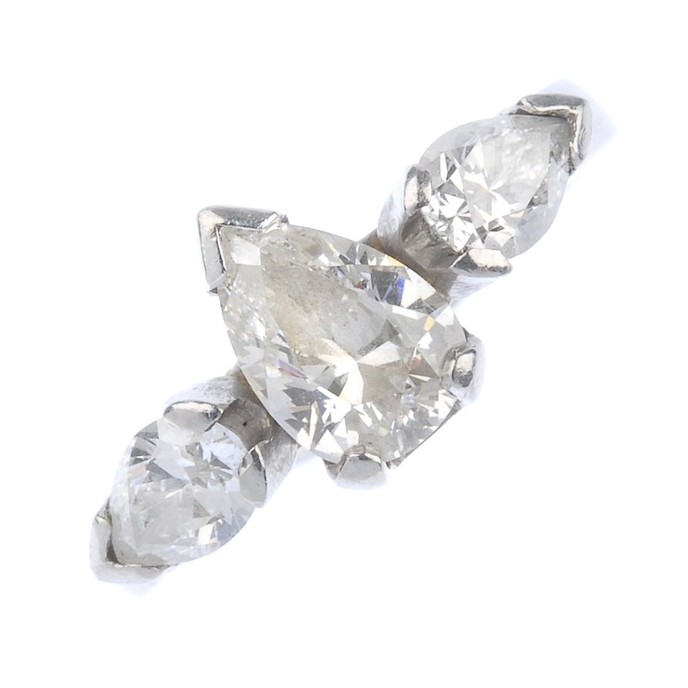 SoldA platinum diamond three-stone ring.A platinum diamond three-stone ring. The brilliant-cut diamond, with similarly-cut diamond sides to the plain band. Estimated total diamond weight 1.20cts, J-L colour, SI clarity. Hallmarks for BirminSee Sold Price