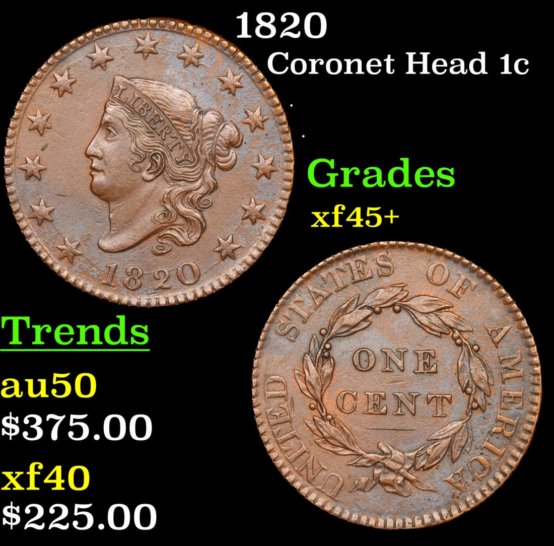 1820 Coronet Head Large Cent 1c Grades xf+++