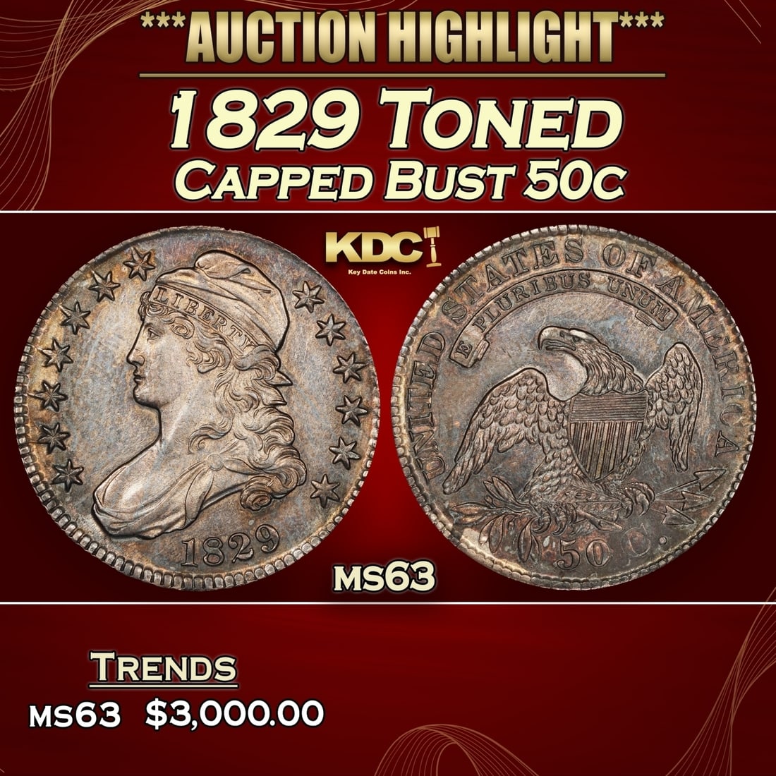 1829 Capped Bust Half Dollar Toned 50c ms63 USCG