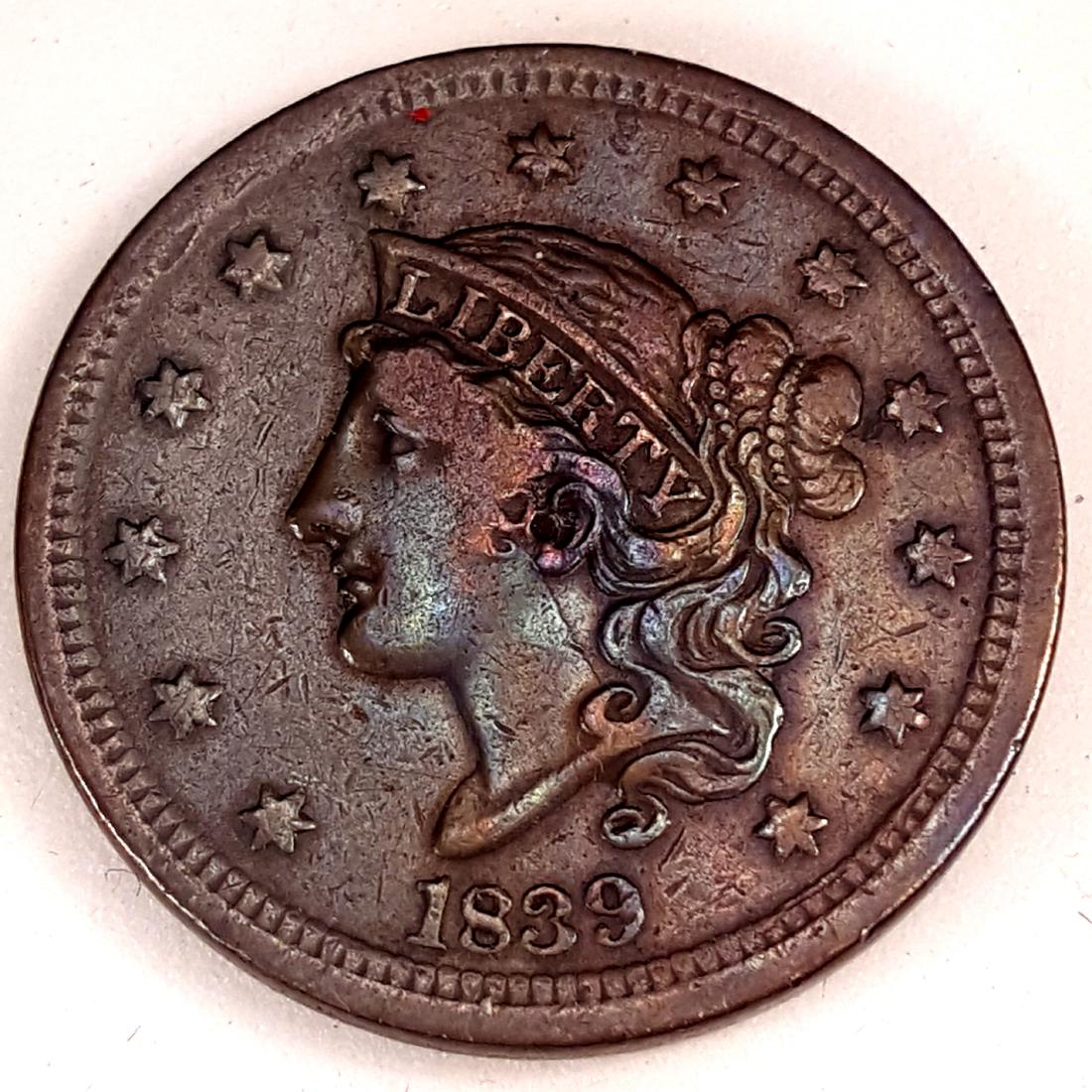 1839 Silly Head Large Cent N.4 R.1 Copper Coin AU/BU Grade