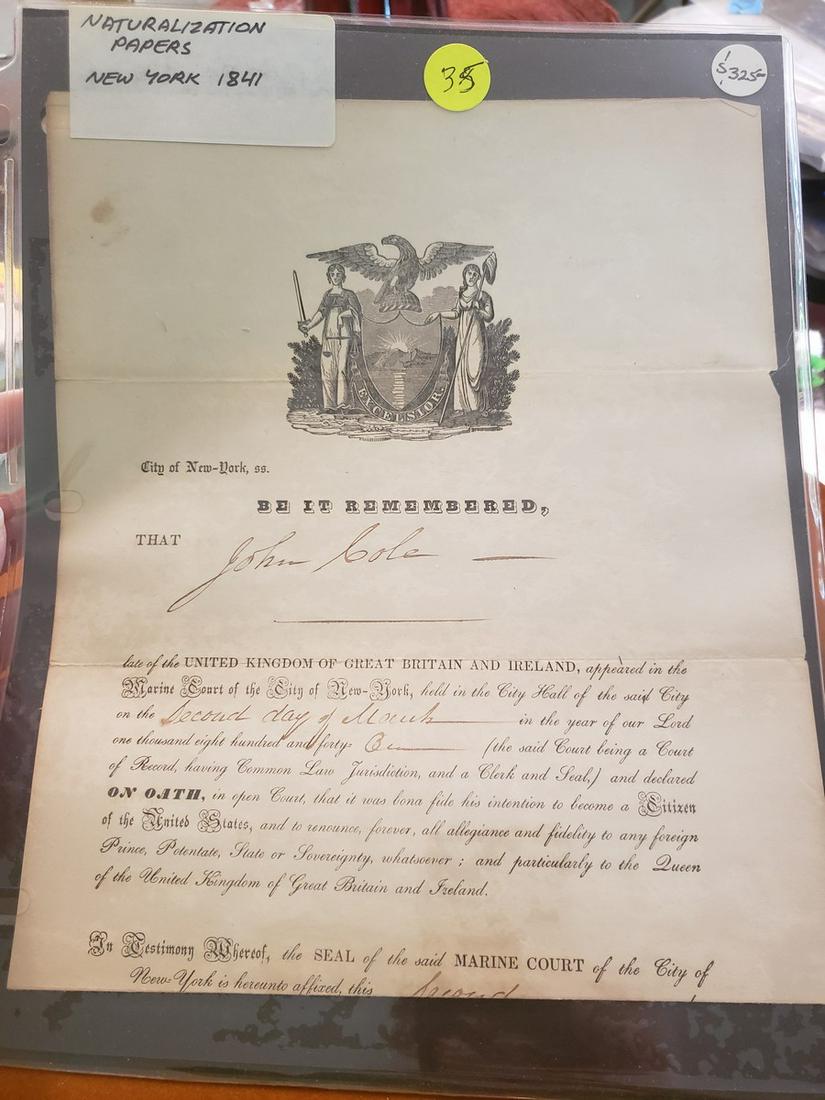 1841 Naturalization papers - New York