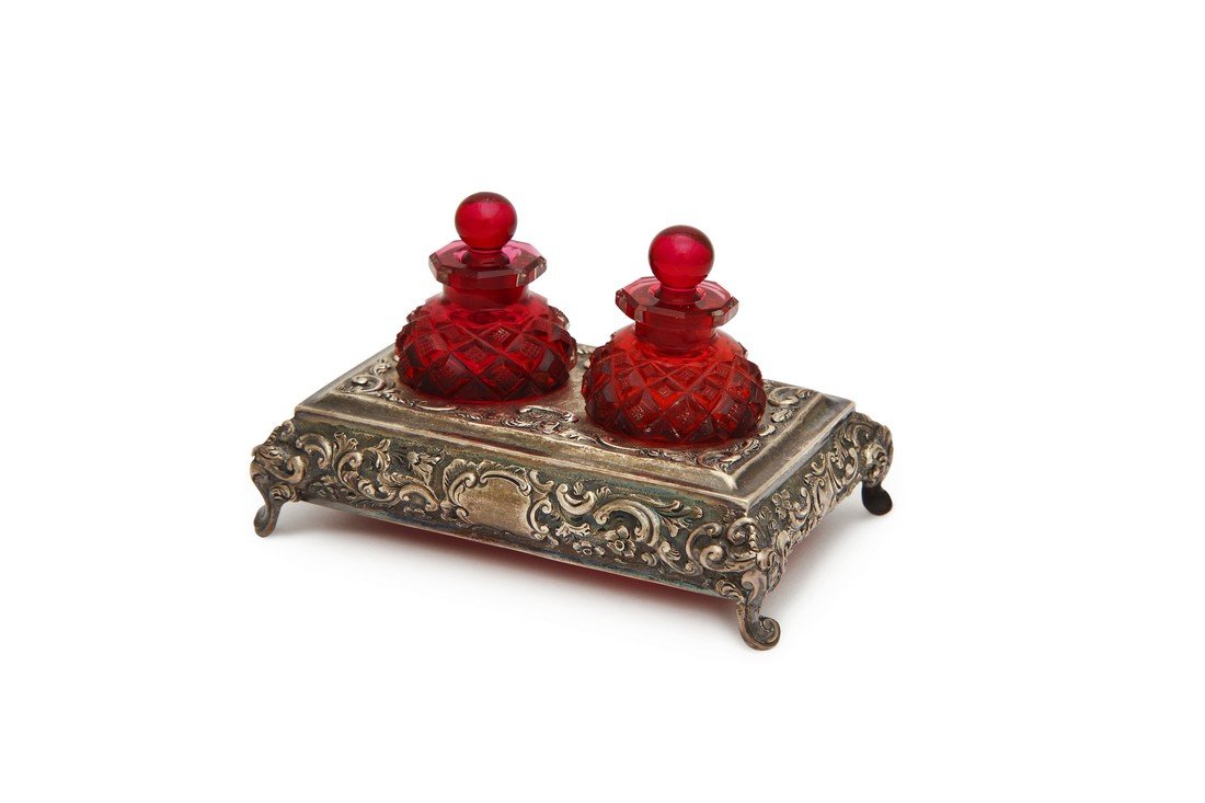 (3) ORMOLU-MOUNTED PEKING GLASS VANITY BOXES & ENAMELED CASKETFeb 22, 2026Vintage Mahogany Three Bottle Cut Crystal Tantalus with Silver Plated MountsA GEORGE III SILVER INK STAND5 days LeftEnglish cruet set, 19th century, consisting of a richly chiseled holder with two cut glass bottles3 days LeftApollo Studios Bronze & Crystal Perfume BottlesFeb 21, 2026London 1880 by Messrs Barnard A pair of Victorian sterling silver candlesticks6 days LeftA GEORGE III SILVER WARWICK CRUET5 days LeftPAIR OF VINTAGE DECORATIVE CUT CRYSTAL PERFUME BOTTLES- AS ISFeb 25, 2026Antique 925 Sterling Silver Floral Chased Ink Well with Crystal InsertFeb 22, 2026Empire perfume bottle, 19th century.527 Lots AwayTWO SILVER GILT SCENT BOTTLES5 days LeftDANIEL & ARTER 1900 London, Bailey Banks & Biddle 6 Pieces Cruet Set Cut Glass6 days LeftA Victorian silver inkstand Charles Stuart Harris, London 1894Elegant 7 Piece Silverplate Cruet Set with Footed Caddy and 6 Glass BottlesFeb 22, 2026Sterling silver accessories. 1) English sterling silver tray and inkwell. 9in wide. Tray: 6.7 ozt.Mar 01, 2026A FANCY ENGLISH SILVERPLATE TANTALUSFeb 22, 2026