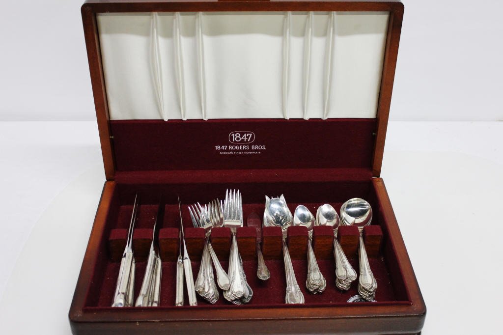 1847 Rogers Silver plate Flatware Set703 Lots Away55 Piece Sterling Silver Wallace "Saxon" Flatware Set26 mins LeftGorham Chantilly Flatware Sterling Silver Silverware 70 PiecesMar 25, 2026Christofle France "Aria" Silverplate Flatware SetMar 07, 2026William Rogers Stainless Flatware Service355 Lots AwayVtg 1847 Roger’s Silver Plate Flatware Set704 Lots AwayReed and Barton Stainless Flatware Service for Twelve357 Lots AwayTuttle Sterling Silver Flatware Set5 days LeftALVIN "Chapel Bells" Sterling Silver Flatware, Service for 12Mar 22, 202664 Piece Sterling Silver Towle "Legato" Flatware Set26 mins LeftInternational Sterling Silver Wild Rose Flatware Set for 8 with 37 Pieces2 days LeftAlvin Sterling Silver Flatware ServiceMar 20, 2026Wallace Sterling Silver Dining Service, Sir ChristopherMar 13, 202672 Piece Sterling Silver Frank Smith "Federal Cotillion" Flatware Set26 mins LeftSilver Plated "Baroque" Flatware 65 Piece SetMar 28, 2026Grandeur “Heirloom" Sterling Silver Flatware Set, 51 PiecesMar 15, 2026