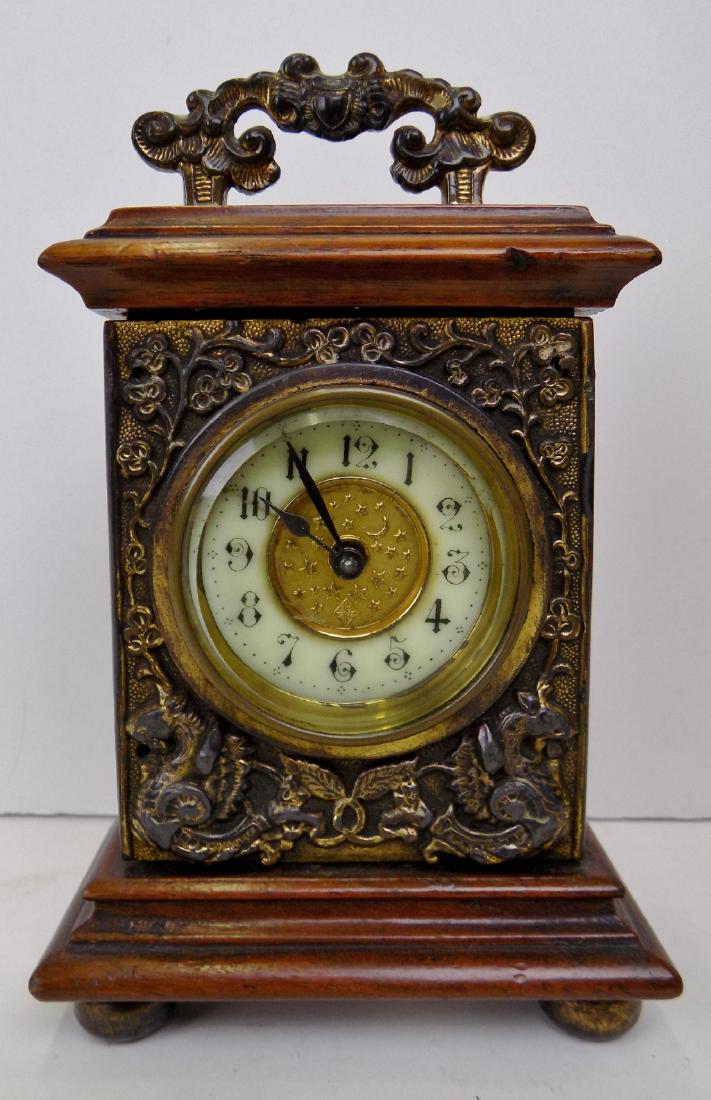 Antique British Clock Company desk clock having a figural floral design with gilt metal fliligree orAntique British Clock Company desk clock having a figural floral design with gilt metal fliligree or cannetille Victorian design. Measures approx. 7 1/8" height x 7 1/4" width. Appears to wind with no