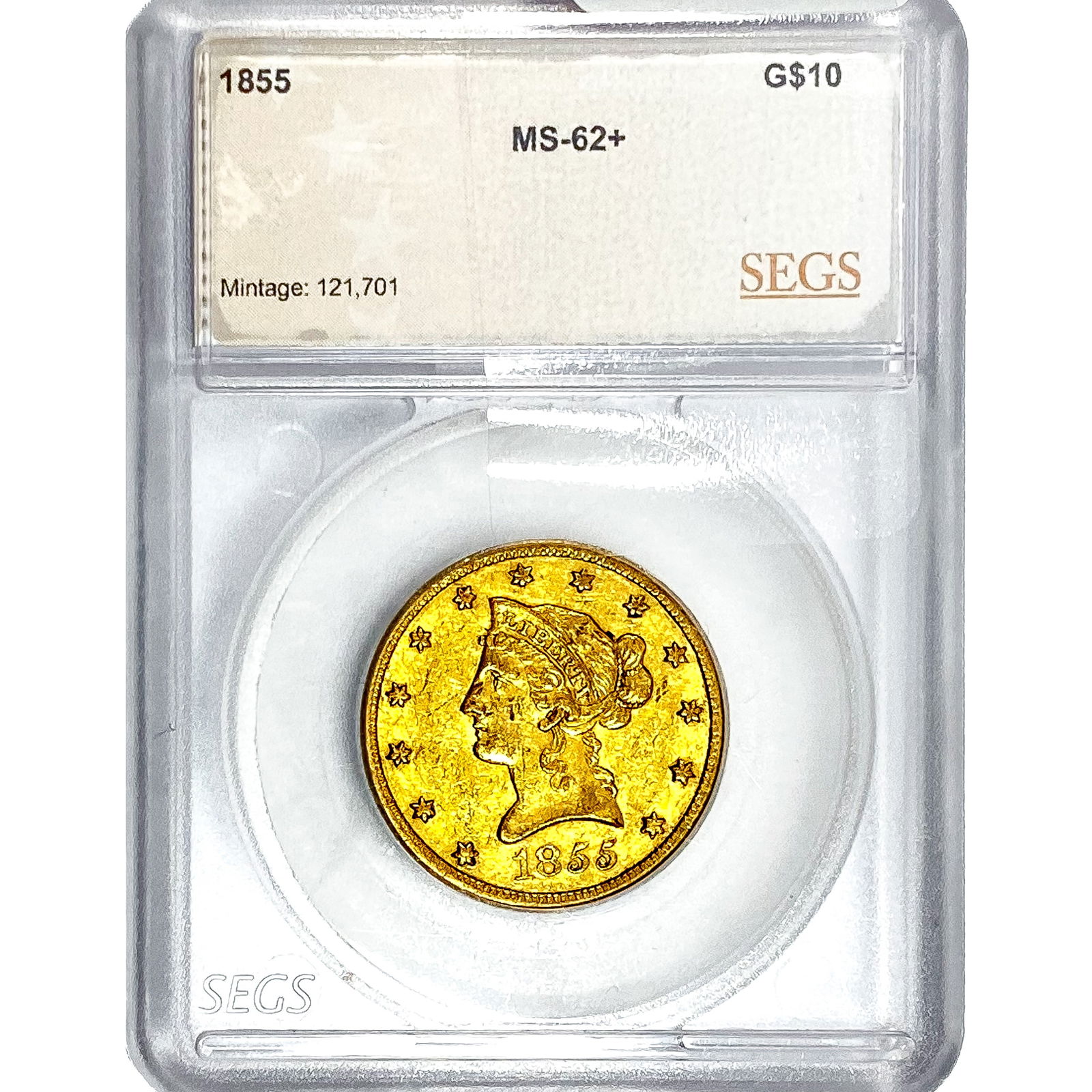 1855 $10 Gold Eagle SEGS MS62+