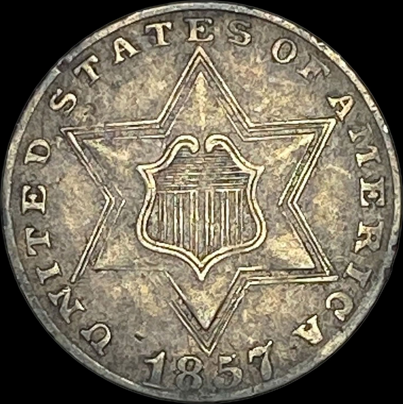1858 TONED Silver Three-Cent Piece CLOSELY UNCIRCULATED
