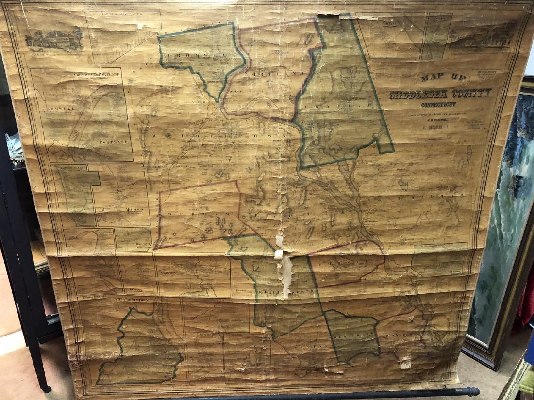 Sold1859 Clark & Hopkins Wall Map Litchfield County CTAntique 1859 Clark & Hopkins Topographical Wall Map of Litchfield County Connecticut, Coated Fabric Backed Paper with Original Rollers. Measures 55 inches x 51 inches. Please note condition issues notSee Sold Price