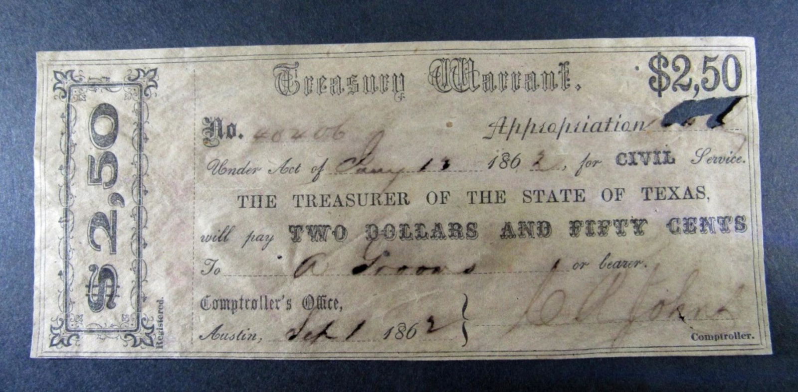 1862 $2.50 TEXAS TREASURY WARRANT