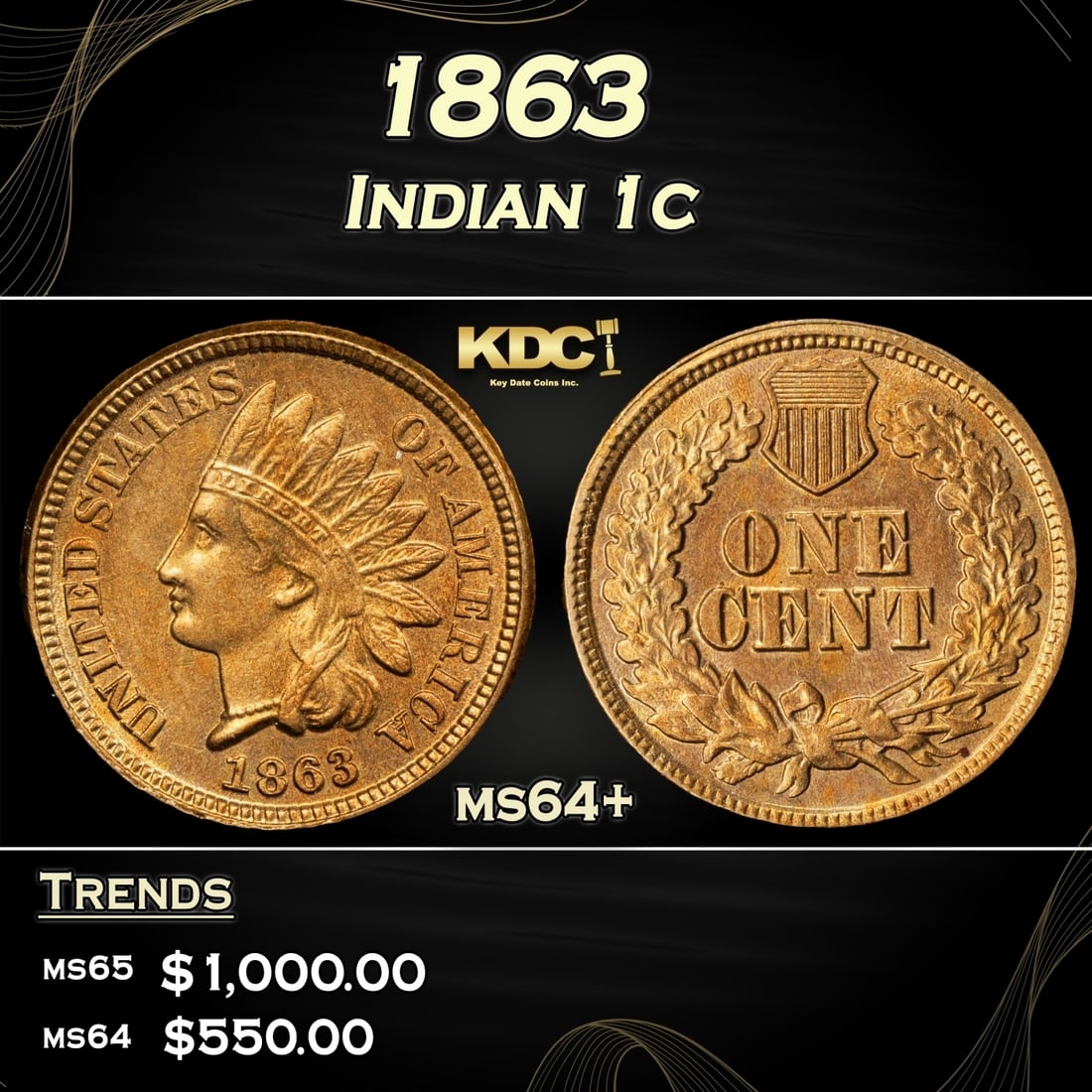 1863 Indian Cent 1c Grades ms64+