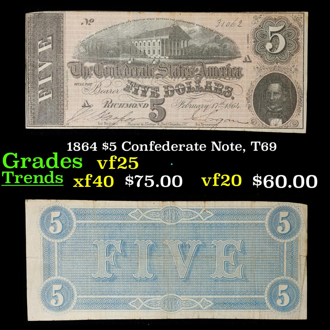 Sold1864 $5 Confederate Note, T69 Grades vf+1864 $5 Confederate Note, T69 Grades vf+. From the seventh and last issue of Confederate currency, these bills were authorized in February 1864. When these $5 notes were issued over 150 years ago, eacSee Sold Price