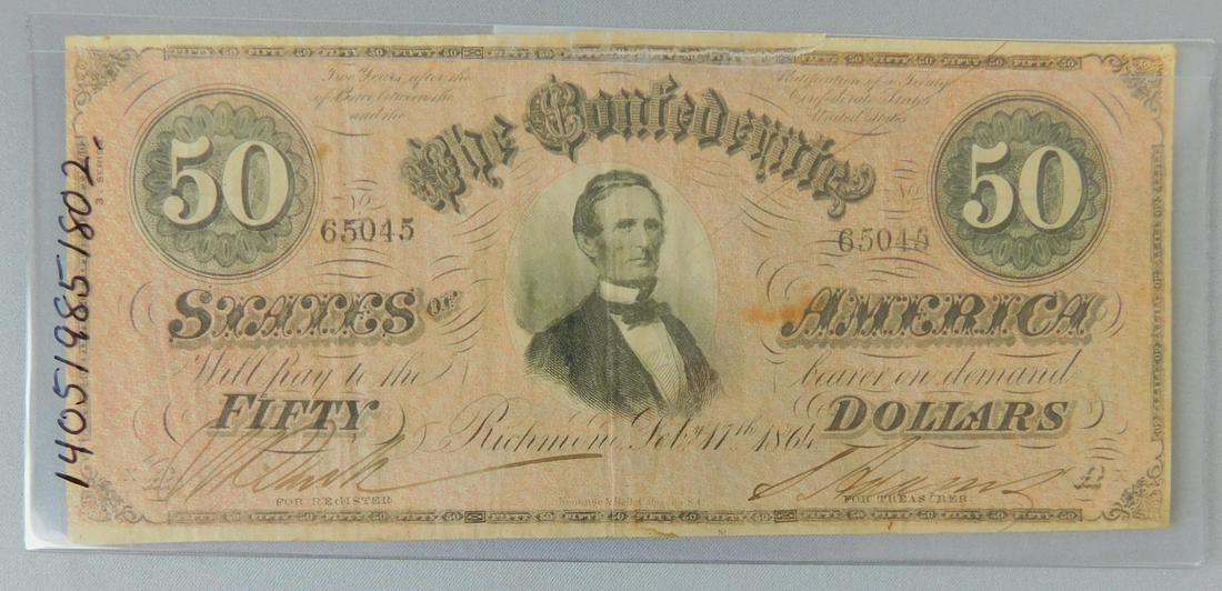 1863 - 1860 Confederate SA $5 & $10 Notes, 2Feb 12, 20261864 $500 Confederate States T-64 PMG Certified VF20 Note10 hrs Left1864 Fifty Cents Confederate Note1 day Left1863 $1 Confederate Note, April 6, 1863 Cancelled.1 day Left1864 $5 Confederate States of America1 day Left1864 $15 Confederate BondConfederate States, 100 Dollar T65 Banknote.Mar 11, 20261864 $100 Confederate Note, Feb 17, 18641 day Left1864 $100 Confederate Note, Feb 17, 18641 day LeftRARE 1861 Confederate States of America $4 Bond Coupon2 days Left1861 $10 Confederate States PMG VF25 Certified Currency6 days Left1864 $15 Confederate Bond1864 $500 Confederate States Note T-64 Uncertified5 days Left1862-63 $100 Confederate Note PMG AU55 Certified6 days Left1864 $20 Confederate States of Amercia1 day Left1864 $50 T-66 Confederate PCGS 631 day Left