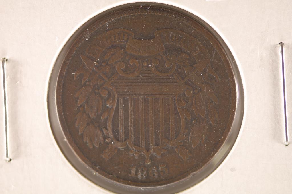 Sold1865 TWO-CENT COIN1865 TWO-CENT COIN ~ U.S. 2 CENT COIN DATED 1865. MARKED FINE + (GRADE HAS NOT BEEN VERIFIED). MOST OF THE WEAR AROUND THE MOTTO. IN PLASTIC SLEEVE.See Sold Price