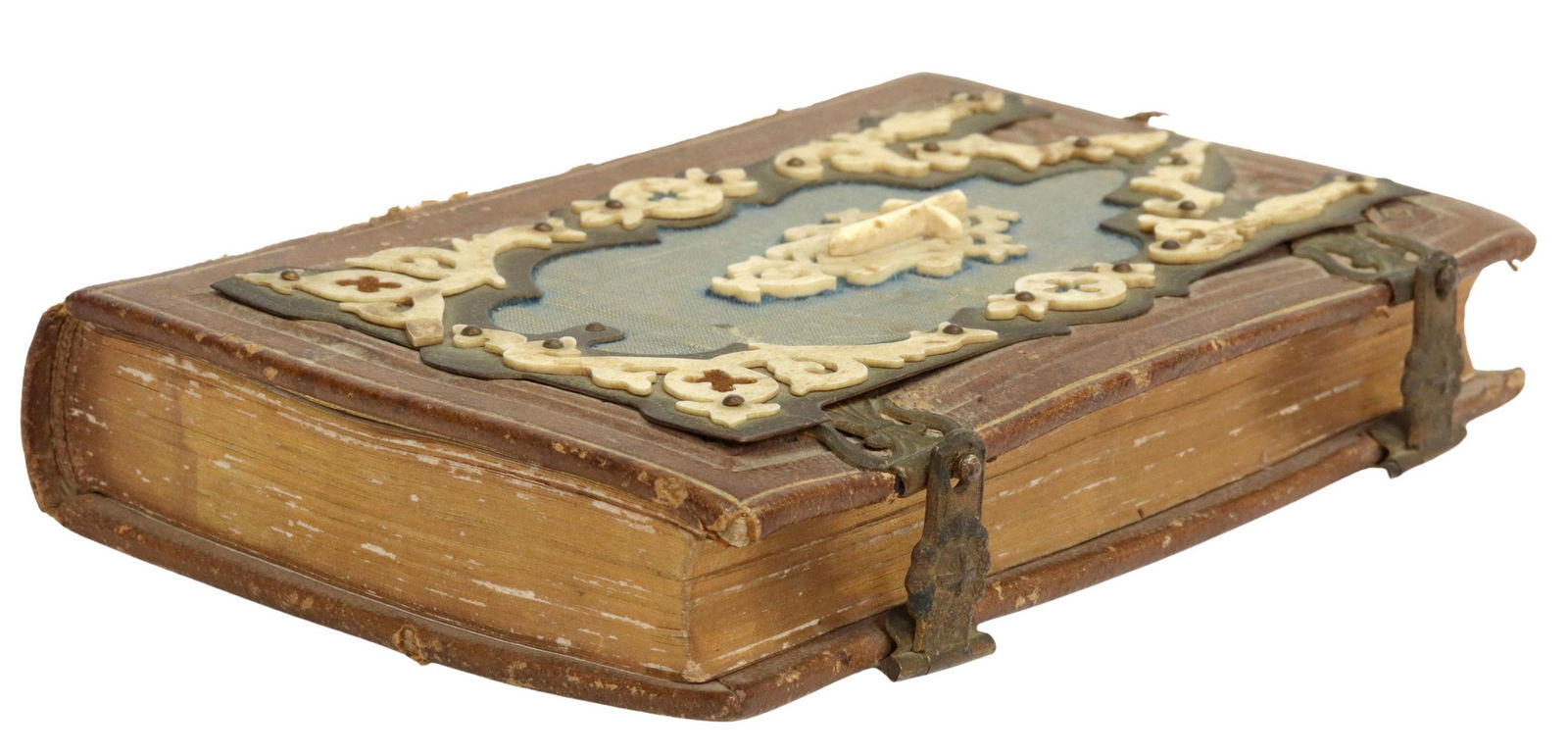 Sold1875 GERMAN PRAYER BOOK W/ NICE METAL DECORATIONS ANTIQUEGERMAN PRAYER BOOK Munchen; 1875 Size 2 3/4 by 4 1/3" xvi, 368 pp. Original leather binding , embossed, front cover with 4 white metal corner pieces and applied brass cross in the middle. Gilt edges.See Sold Price