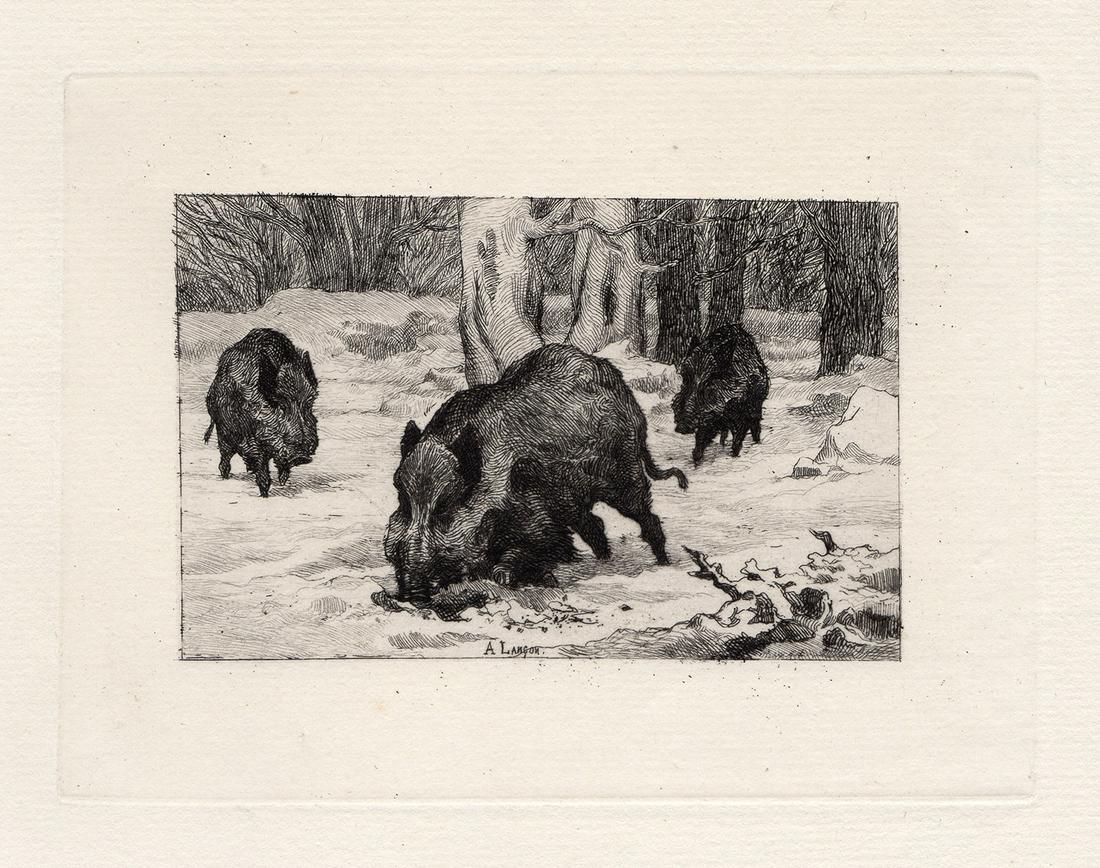 1874 Auguste Andre Lancon Wild Boars etching signed