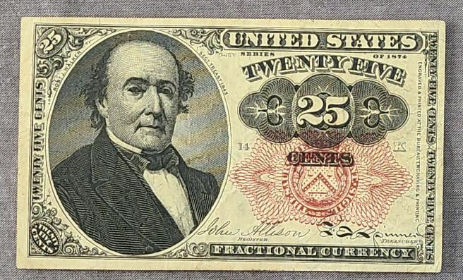1874 U.S. 25¢ Fractional Currency, Fifth IssueMar 15, 20261874 U.S. 25¢ Fractional Currency Note, Fifth IssueMar 15, 2026United States Fractional Currency – Series of 1874 – 25 Cents – Civil War Era Pape1874 U.S. 10¢ Fractional Currency, Fifth IssueMar 15, 20261869 U.S. 10¢ Fractional Currency Note – Fourth IssueMar 15, 20261864 United States 3¢ Fractional Currency Note, Third Issue, George WashingtonMar 15, 20261862 Confederate States of America Two Dollar1878 $20 Legal Tender Note PMG 53Mar 07, 20261863 Confederate States of America Two Dollar1862 $20 Legal Tender Note PCGS 154 days Left1981 $20 Federal Reserve Note FR2073L Uncertified Choice UNC4 days LeftSeries of 1929 Twenty Dollar National Currency in Very Fine PlusA 1862 Historical "Green Back" Dollar in Very Fine 25 ConditionMar 28, 20261863 Confederate States of America One Dollar1891 $20 Treasury Note PMG 65EPQMar 07, 202625 Cent Third Issue Fr. 1294 Fractional Note Green Back PCGS 63663 Lots Away