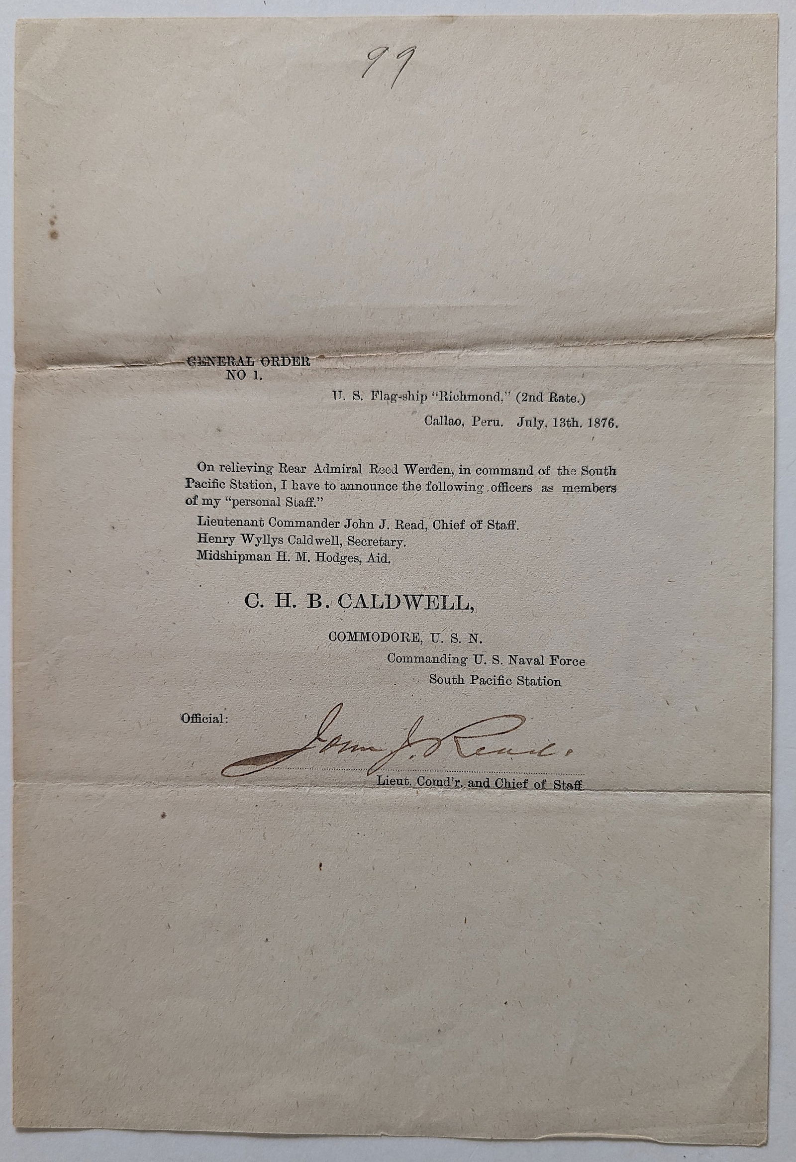 1876 Naval Order Promoting Lt. Comdr John Read , Signed