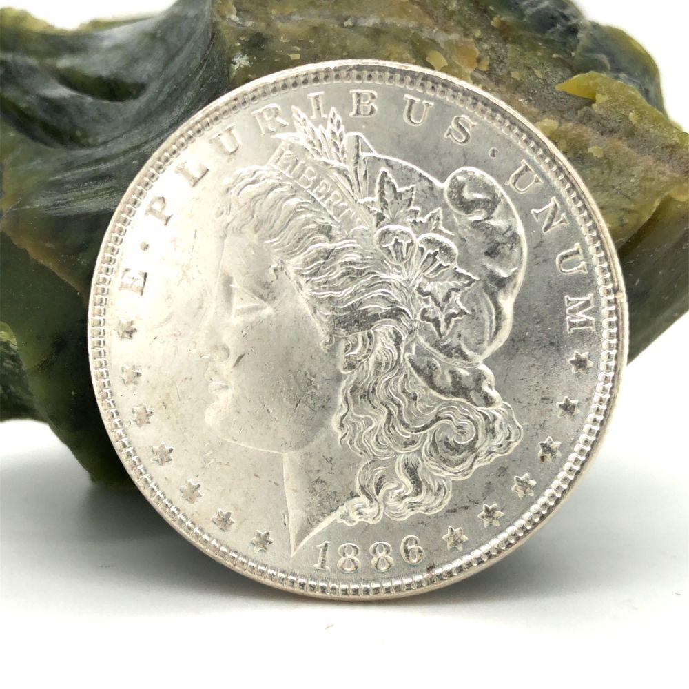Sold1886 Morgan Silver Dollar Choice Unc.A well struck 1886 Morgan Silver Dollar in Choice Uncirculated condition. A superior coin with hardly any distractions and nice original rim toning. Super nice!.See Sold Price