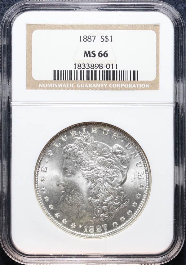 Sold1887 MORGAN SILVER DOLLARNGC MS 66 BLAST WHITE, SUPER GEM! MS 66 MORGANS ARE VERY CHEAP! ESTIMATE: $325-$425See Sold Price