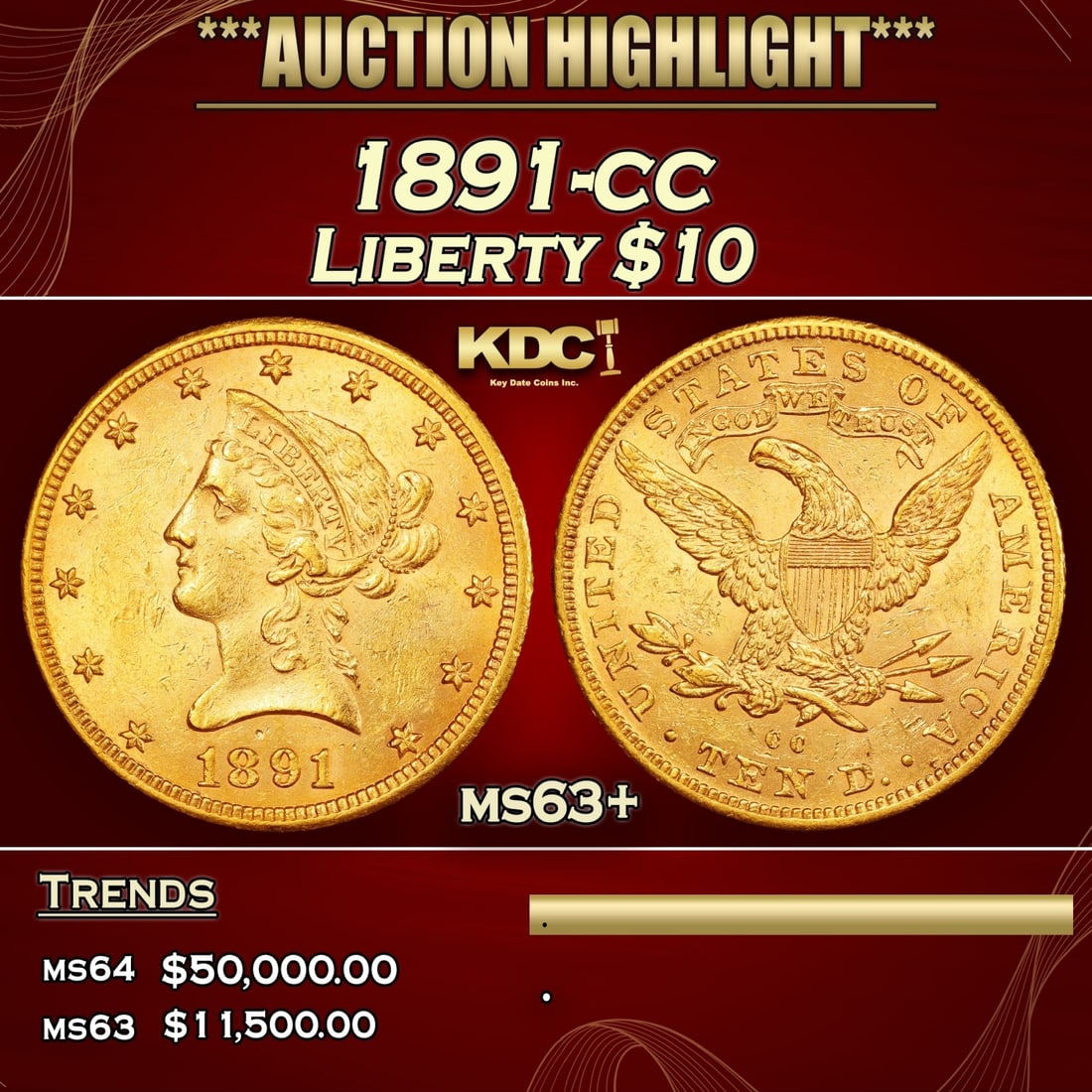 1891-cc Gold Liberty Eagle $10 Grades ms63+