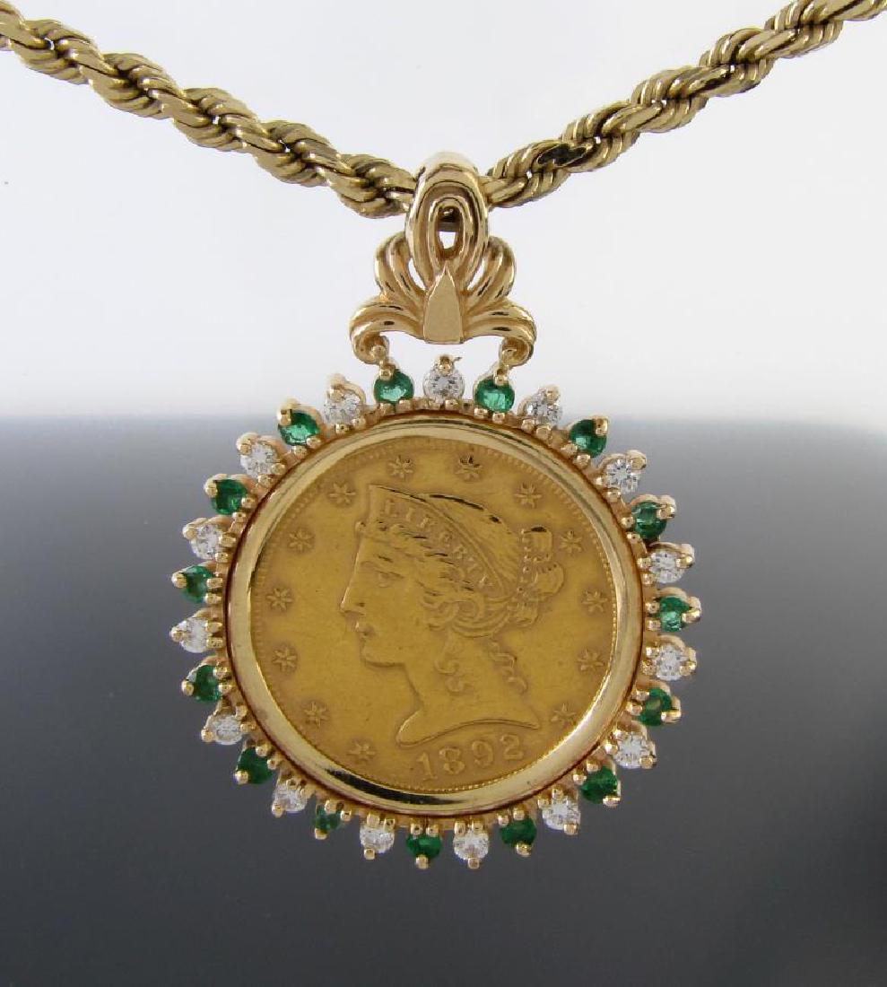 SoldEmerald & Diamond Pendant,round emerald weighing .06 carat surrounded by 18 round diamonds totaling .75 carat in 14K white gold, 5.6 grams, with appraisal of $1,950.00, 1" long with bale.See Sold Price