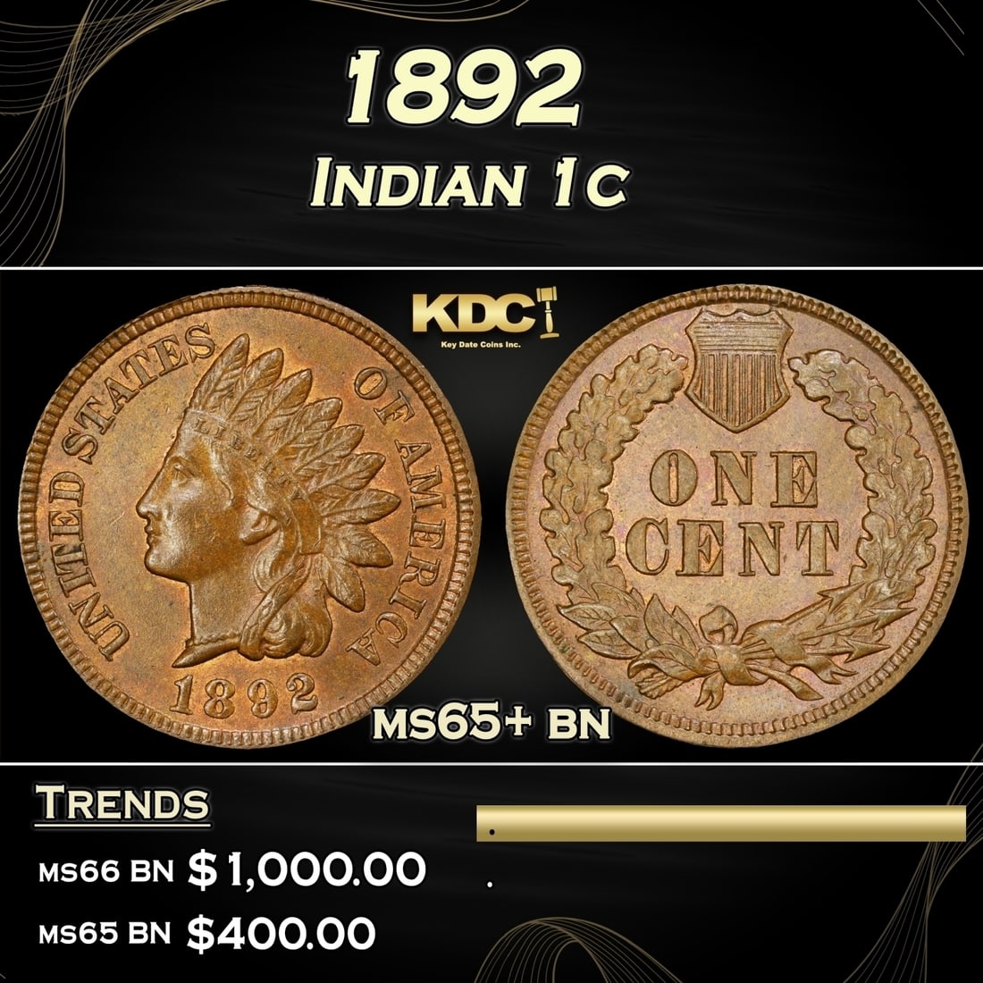 1892 Indian Cent 1c Grades ms65+ bn