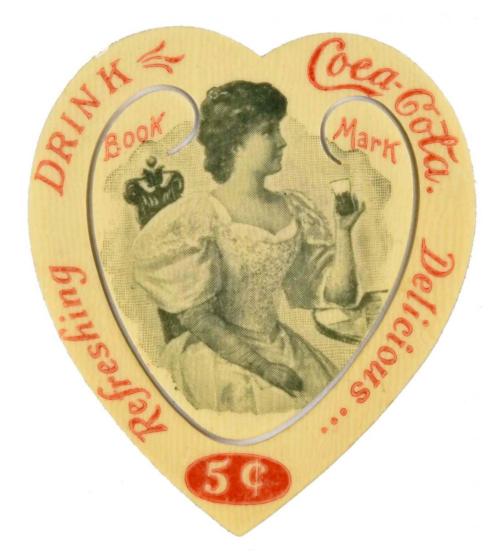 Coca-Cola Bookmark, c.1900, celluloid heart w/pretty girl at soda fountain drinking from glass, RareCoca-Cola Bookmark, c.1900, celluloid heart w/pretty girl at soda fountain drinking from glass, Rare 5 Cent w/"Delicious, Refreshing Drink Coca-Cola" on perimeter, nicely displayed in early heart-shap
