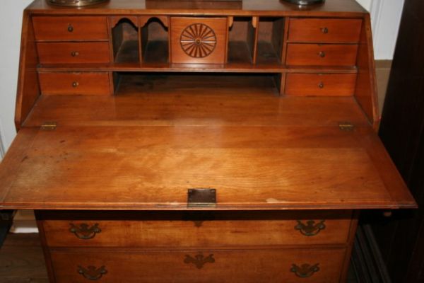 18C. AMER. MAPLE SLANT FRONT DESK, FITTED INTERIO