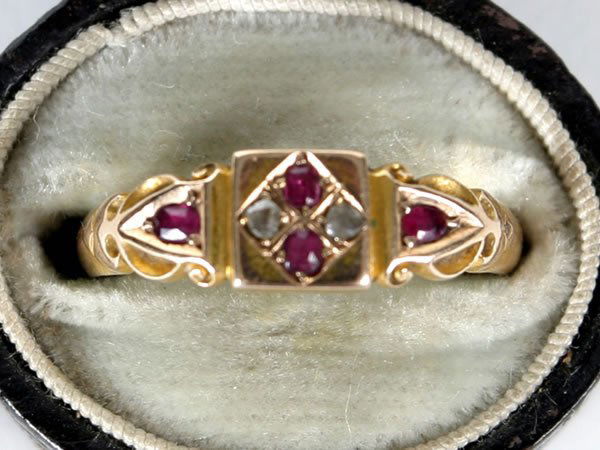 SoldAN ANTIQUE VICTORIAN DIAMOND AND RUBY DRESS RING, 1897AN ANTIQUE VICTORIAN DIAMOND AND RUBY DRESS RING, 1897 in 18ct yellow gold, set with a trio of graduated old cut diamonds, the largest of 0.38 carats, punctuated by two cushion cut rubies, and accenteSee Sold Price