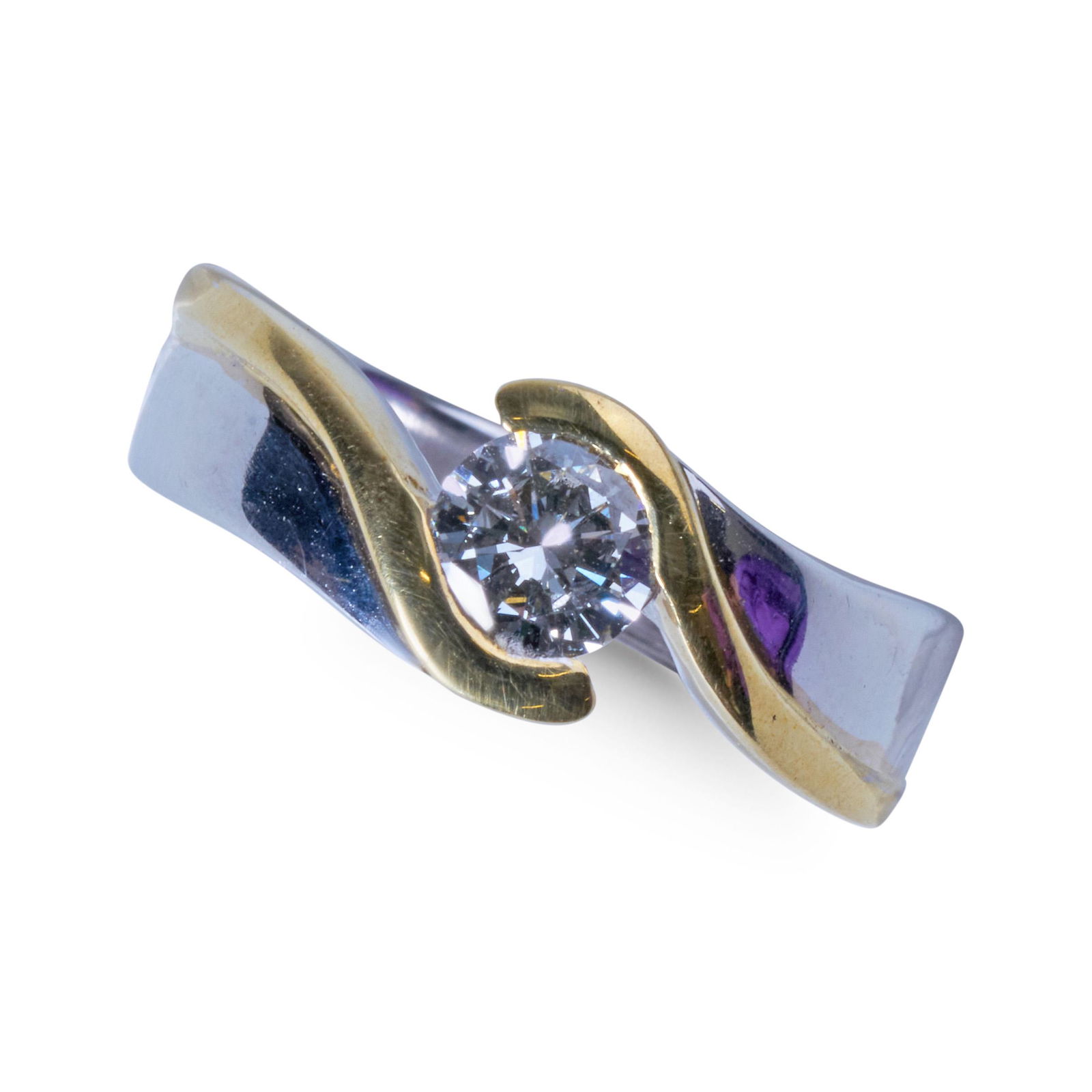 18CT YELLOW AND WHITE GOLD DIAMOND SOLITAIRE RING.