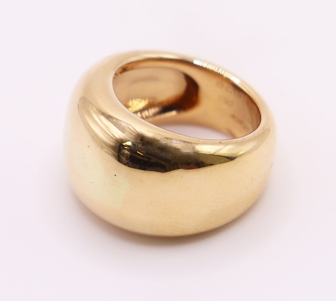 SoldCartier 18K Gold Dome RingMETAL: 18k Gold. MEASUREMENTS: Ring size 7 1/2, ring band is 14mm at widest point. MARKED: Cartier 199, 750, 53 G 50658. WEIGHT: 13 grams.Gemstones have not been graded for color and clarity ,and testSee Sold Price