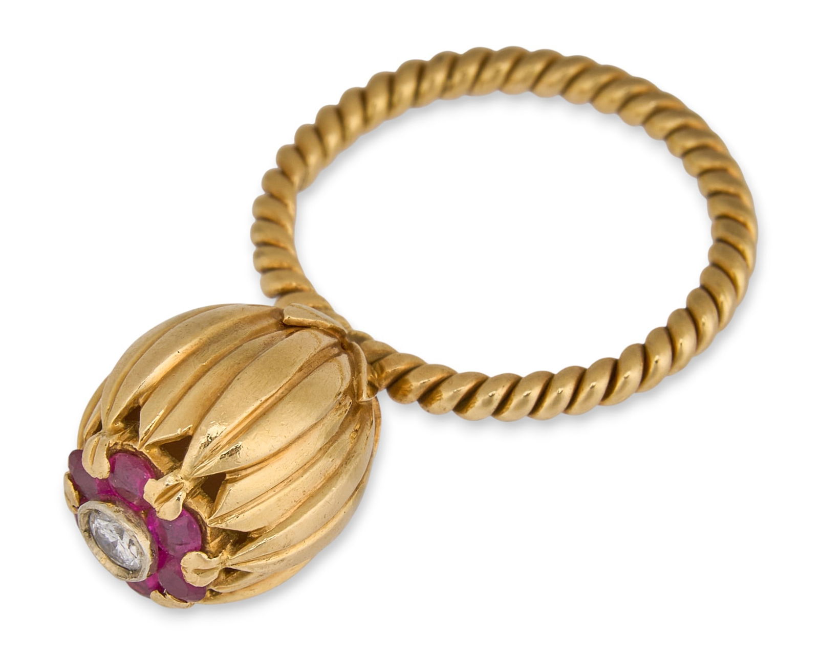 Sold18K Yellow Gold Ruby & Diamond Floriform RingVintage 18K yellow gold ruby and diamond floriform design ring, set with rubies and diamonds forming a central flower motif accentuated with filigree open latticework details. Central oval faceted cutSee Sold Price