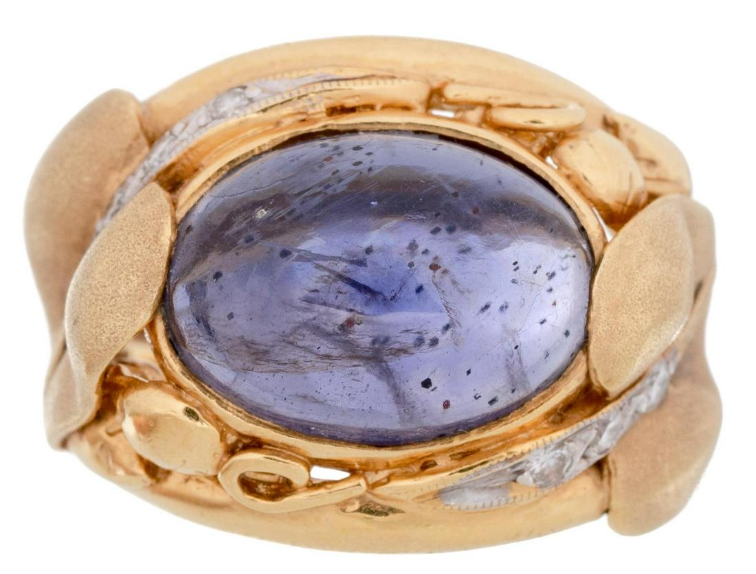 SoldJEWELRY: 18K yellow gold dome amethyst & diamond ring, tested 18K, measuring 25 x 23 mm across theJEWELRY: 18K yellow gold dome amethyst & diamond ring, tested 18K, measuring 25 x 23 mm across the top with tapered shank measuring 5 mm wide at the base, centering the ring is an oval faceted dark puSee Sold Price