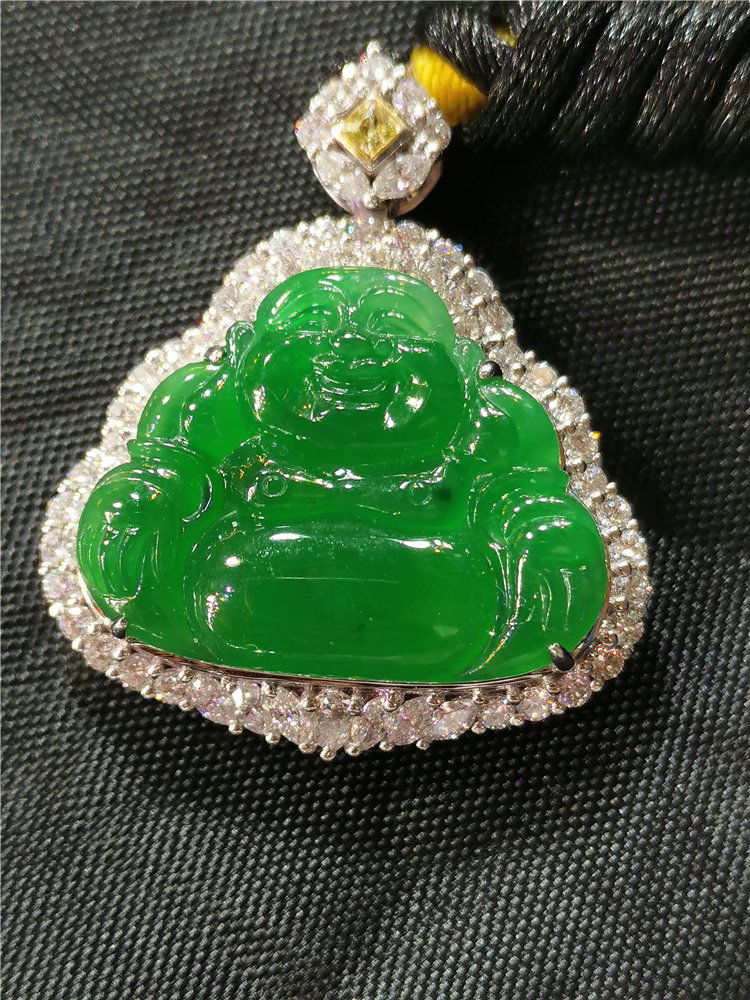18K Gold Buddha Green Jadeite PendantPlace of Origin: Myanmar.Material: Jadeite,18K Gold,Diamond.size:36.4X32.7X9.8mm.Condition: new..Description: Natural jade, has bright and beautiful color。Guarantee natural and acquire cSee Sold Price
