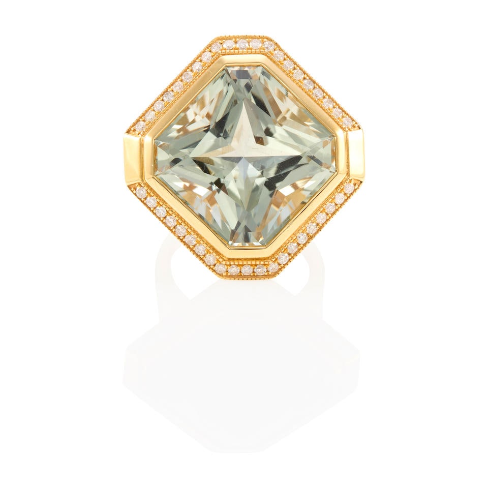 18K GOLD, PRASIOLITE AND DIAMOND RING