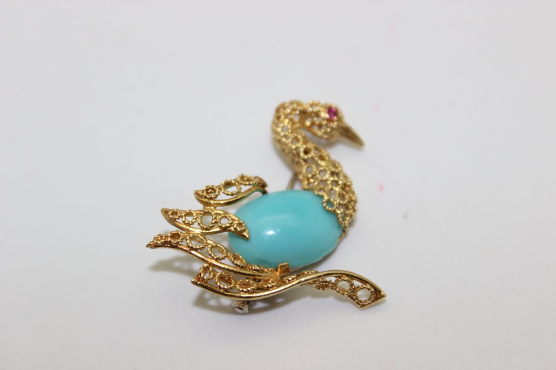 SoldVintage 18K Gold and Turquoise Bird BroochVintage 18K Gold and Turquoise Bird BroochMid 20th c., Continental18k yellow gold bird brooch featuring turquoise cabochons. Unmarked, tested 18k. 16 grams / 10.23 dwt total weight.3.25"L x 2.25"WSee Sold Price