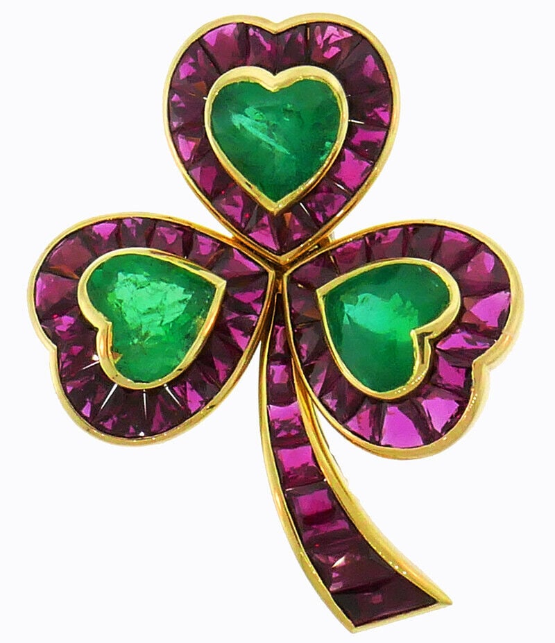 18k Hemmerle Vintage Ruby Emerald Clover Pin