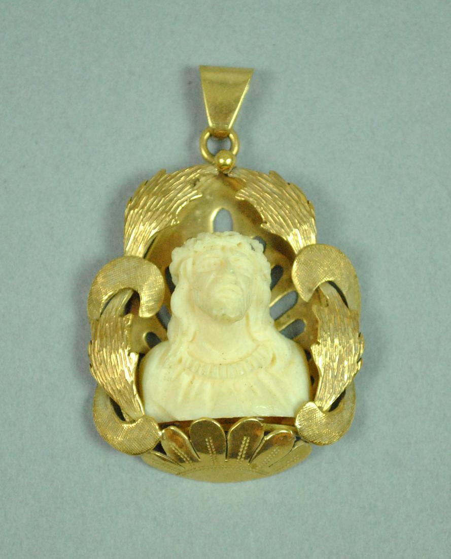 18K MOUNTED CARVED BONE RELIGIOUS PENDANT