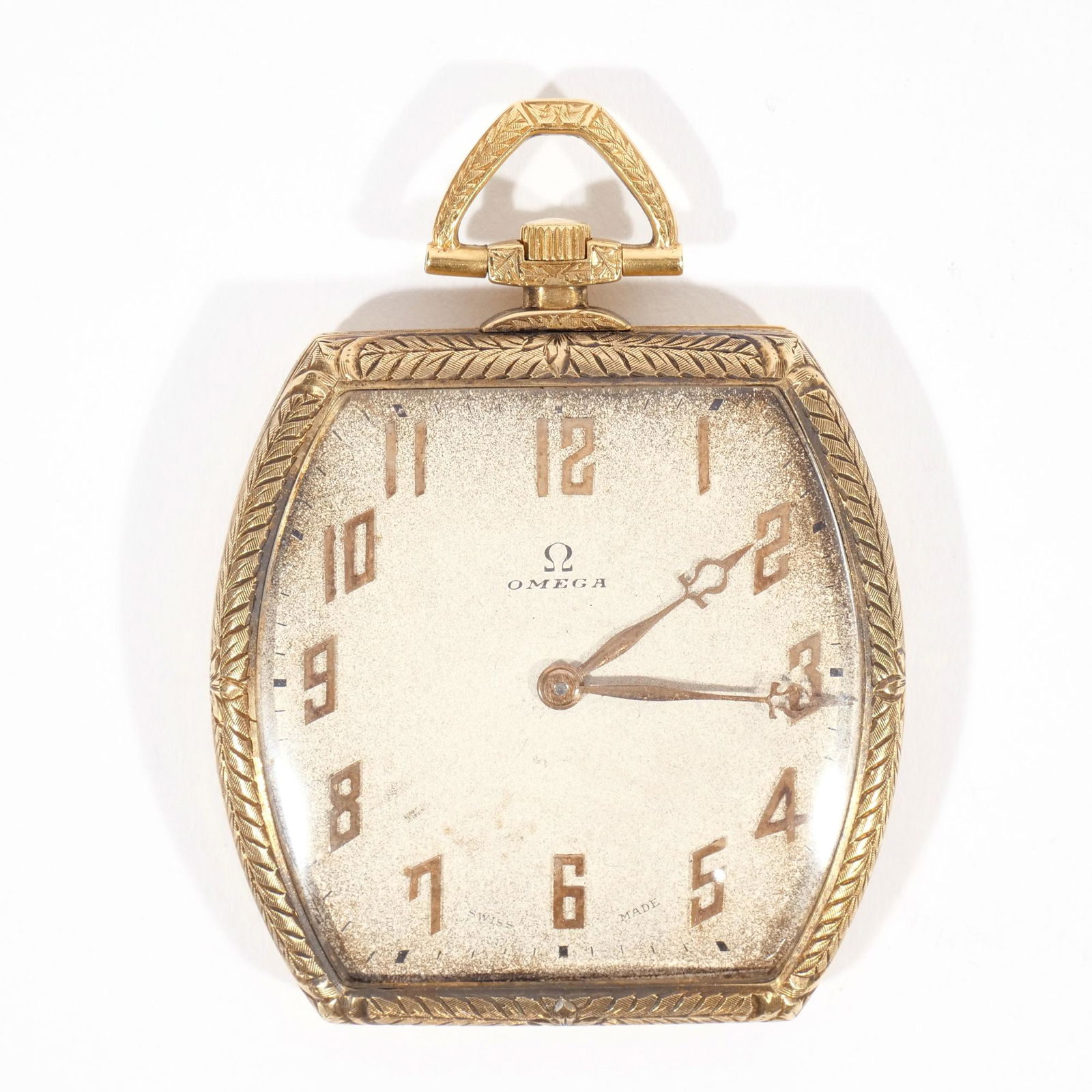 SoldCa. 1930 OMEGA Scherraus & Co. St. Gallen Switzerland 18K Gold Pocket WatchBeautiful Vintage 1930s Art Deco OMEGA Switzerland 18K Yellow Gold Open Face Pocket Watch. Beautifully simple and stylish gold dial with gold hands and stylish black Arabic numerals. Small second at tSee Sold Price