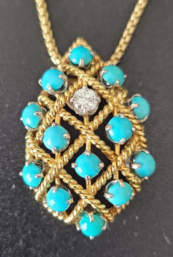 SoldItalian 18K Gold Diamond Turquoise Pendant NecklaceMETAL: 18k Gold. GEMSTONES: Diamonds approx. 1.50ctw. Turquoise. MEASUREMENTS: Necklace is 17.5" long, Pendant - 36mm long with bail x 17.5mm at widest point. MARKED: Italy 750 on chain clasp, 75See Sold Price