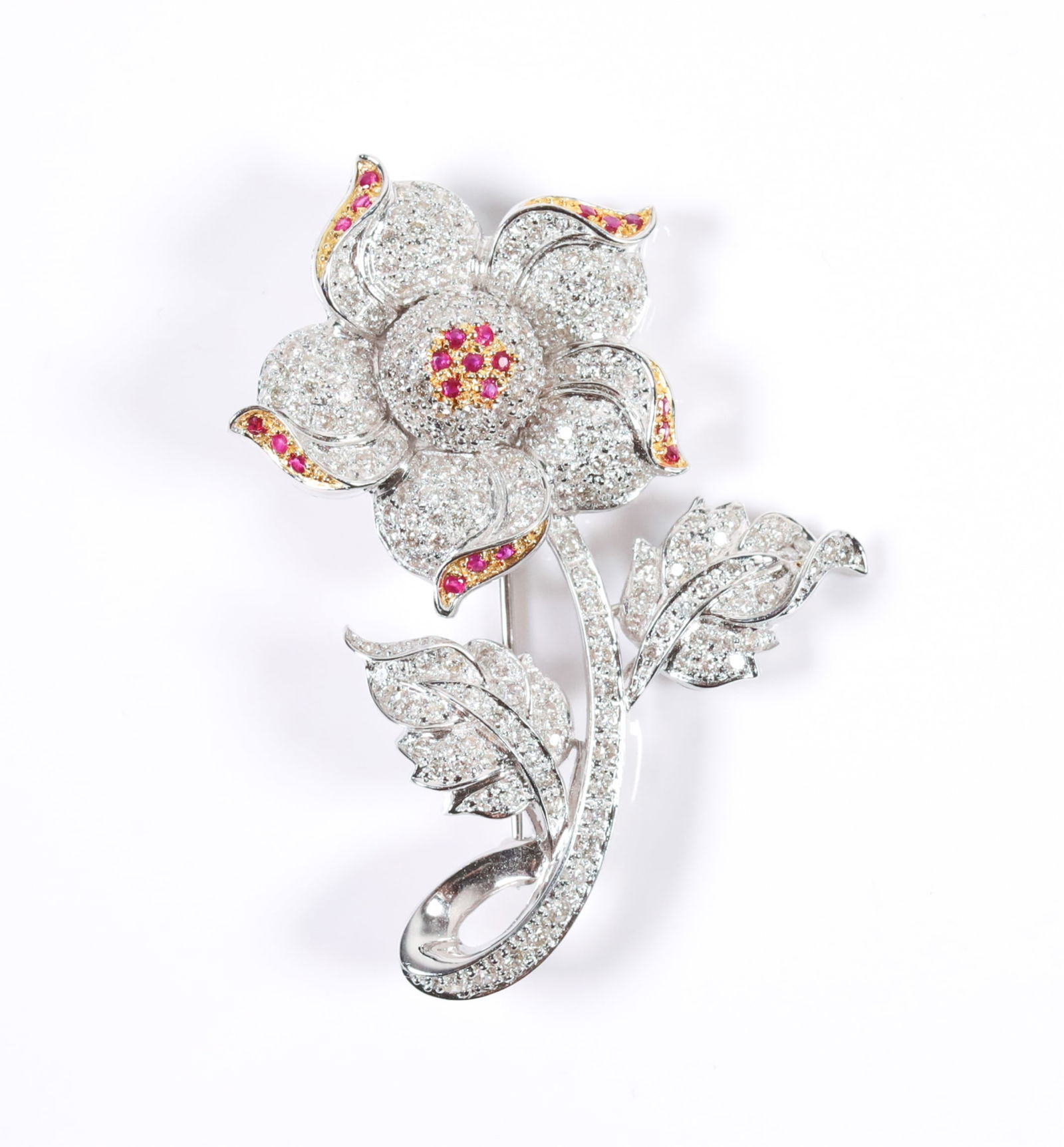 18K WG DIAMOND AND RUBY FLOWER BROOCH