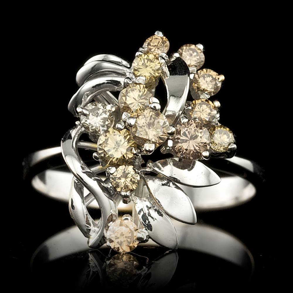 Sold18k White Gold Diamond RingMETAL: 18k White Gold. GEMSTONES: Diamonds approx. 2.88 ctw. MEASUREMENTS: Size 7 1/4, top measures 28mm x 23mm. MARKED: 18k, 750. WEIGHT: 9.3 grams. Gemstones have not been graded for color and clariSee Sold Price