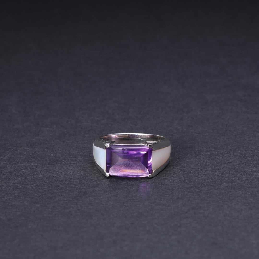 SoldLadies 18K White Gold Amethyst RingAmethyst set in a 18k white gold Edwardian setting. Condition the ring is split and it has a ring guard on it. Size 7.See Sold Price